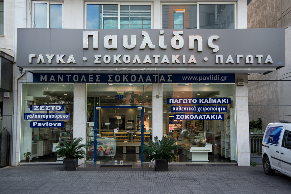 Αφήσαμε την εποχή του ’60 πίσω μας και κατευθυνθήκαμε προς το λόφο της Κατεχάκη. Ναι, η αλήθεια είναι πως σήμερα δεν δίνει την αίσθηση αυτή, όμως πριν από μισό αιώνα από τον αριθμό 59, όπου τελείωνε και η οδός Κατεχάκη, όλη η Αθήνα μπορούσε να δει την πινακίδα του Παυλίδη για το πιο φρέσκο παγωτό καϊμάκι. “Όλη η Νέα Φιλοθέη έβλεπε την πινακίδα “Παγωτό Καϊμάκι, ο Παύλος” μας λέει ο Στέλιος Παυλίδης που μας υποδέχεται στο ζαχαροπλαστείο.