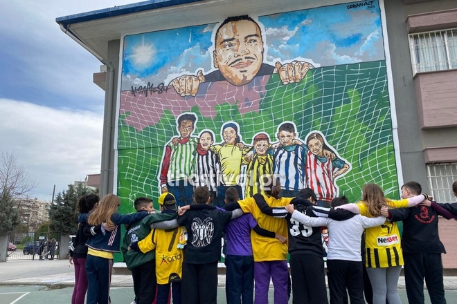 Θεσσαλονίκη: Μαθητές φόρεσαν τις φανέλες των ομάδων τους και τραγούδησαν μπροστά από γκράφιτι με τον Άλκη Καμπανό