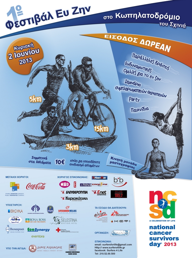 Το 2ο Φεστιβάλ Ευ Ζην που διοργανώνεται την Κυριακή 1η Ιουνίου 2014 στα πλαίσια της Παγκόσμιας Ημέρας Επιζώντων Καρκίνου στο Κωπηλατοδρόμιο του Σχινιά έχει σκοπό να συνεχίσει την επιτυχημένη αυτή προσπάθεια που πραγματοποιήθηκε πέρσι κατακτώντας τους εξής στόχους: