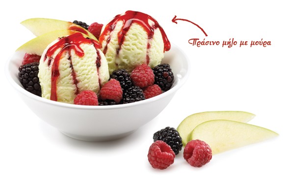 Προχωρώντας την τέχνη της δημιουργίας ακόμη πιο μακριά, η «δωδώνη» μεταμορφώνει το πράσινο μήλο σε παγωτό και το εμπλουτίζει με μούρα παρουσιάζοντας το Πράσινο Μήλο με Μούρα.