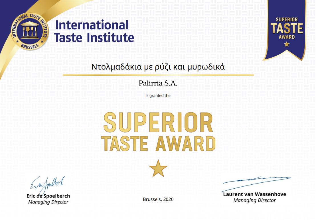 Η Παλίρροια συνεχίζει να αποσπά βραβεία για την γεύση των προϊόντων της, τόσο στην Ελλάδα όσο και στο εξωτερικό, αυτή τη φορά με το Superior Taste Award για τα ντολμαδάκια γιαλαντζί, με ρύζι και μυρωδικά
