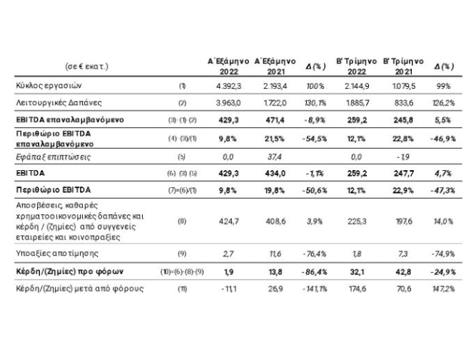 Επαναλαμβανόμενο EBITDA ύψους €429,3 εκατ. το α΄ εξάμηνο 2022 από €471,4 εκατ. το α΄ εξάμηνο 2021 - Ανθεκτικότητα των αποτελεσμάτων για ένα ακόμη τρίμηνο
