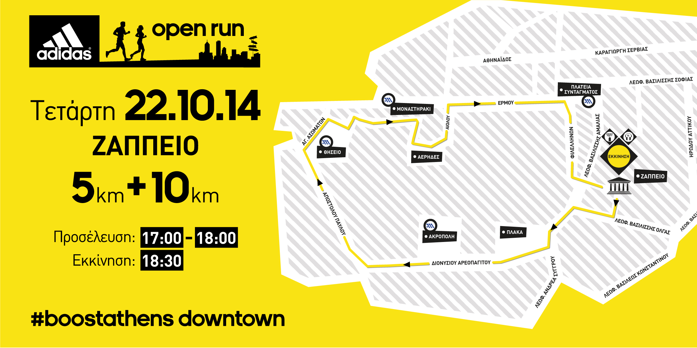 Σε περιμένουμε την Τετάρτη, 22 Οκτωβρίου 2014 στις 18:30 (οι εγγραφές ξεκινούν στις 17:00) για να γεμίσουμε το κέντρο της Αθήνας με τη δική μας ενέργεια και να δούμε αγαπημένα σημεία της πόλης μας με τη δική μας ματιά, αυτή των urban runners.
