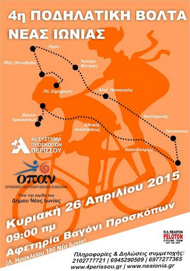 Tο 4ο Σύστημα Προσκόπων Περισσού μαζί με τον Οργανισμό Πολιτισμού Άθλησης Νεολαίας Ν. Ιωνίας υπό την αιγίδα του Δήμου Νέας Ιωνίας, διοργανώνουν την 4η Ποδηλατική Βόλτα Νέας Ιωνίας, την Κυριακή 26 Απριλίου 2015 στις 09:00πμ.