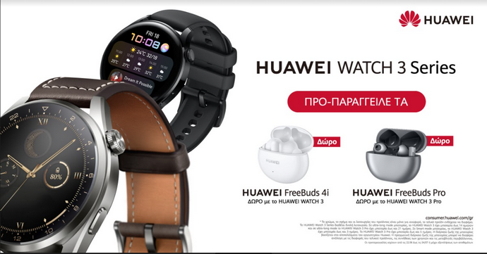 To HUAWEI Watch 3 διατίθεται σε Active, Classic και Elite Edition στα καταστήματα: ΚΩΤΣΟΒΟΛΟΣ, ΠΛΑΙΣΙΟ, Public, MediaMarkt, WIND, Electronet, You.gr, WelcomeStores, Euronics και Expert Hellas από 22 Ιουνίου έως και 4 Ιουλίου, και μέχρι εξαντλήσεως των αποθεμάτων, με δώρο με δώρο τα wireless ακουστικά με Active Noise Cancelation HUAWEI FreeBuds 4i.