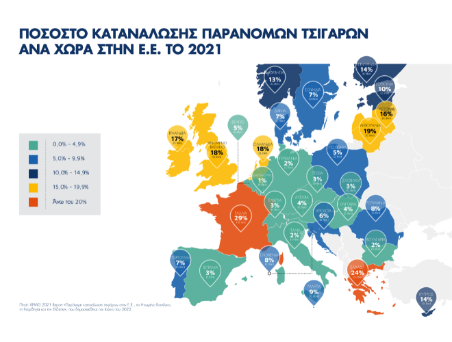 Σε επίπεδο Ε.Ε. η κατανάλωση παράνομων τσιγάρων αυξήθηκε κατά 3,9% το 2021, φτάνοντας τα 35,5 δισ. τσιγάρα (1,3 δισ. περισσότερα παράνομα τσιγάρα συγκριτικά με το 2020), με τη Γαλλία να καταγράφει σημαντική αύξηση στην κατανάλωση παράνομων τσιγάρων και να διατηρεί την πρώτη θέση.