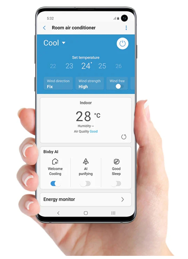 Τη σειρά WindFree™ COMFORT. Μέσω της τεχνολογίας WindFree™, ο αέρας διαχέεται ομοιόμορφα και αθόρυβα μέσα από 23.000 μικροοπές, εξαλείφοντας έτσι τη δυσάρεστη αίσθηση ψυχρών ρευμάτων. Η προηγμένη ροή αέρα που διαθέτει, δροσίζει επίσης πιο ομοιόμορφα μεγαλύτερους χώρους και χρησιμοποιεί 77% λιγότερη ενέργεια από τη λειτουργία Fast Cooling. Παράλληλα, διαθέτει τεχνολογία AI Auto Comfort, η οποία αυτόματα βελτιστοποιεί τις διάφορες λειτουργίες και ρυθμίζει τη θερμοκρασία, αναλύοντας τις συνθήκες στο χώρο και τα μοτίβα χρήσης, διατηρώντας τις βέλτιστες συνθήκες. Επιπλέον, χάρη στην εφαρμογή SmartThings, ο χρήστης μπορεί να ελέγξει και να παρακολουθήσει απομακρυσμένα τη λειτουργία του κλιματιστικού. Αξίζει τέλος να αναφερθεί, ότι με τη λειτουργία Auto Clean, το κλιματιστικό καθαρίζεται αυτόματα σε μόλις τρία βήματα, προλαμβάνοντας τη συσσώρευση βακτηρίων και οσμών.