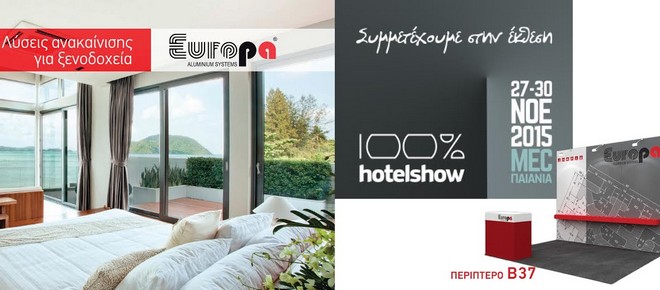 Η EUROPA PROFIL ΑΛΟΥΜΙΝΙΟ Α.Β.Ε., παρακολουθώντας και συμμετέχοντας στις εξελίξεις του τεχνικού κόσμου, παίρνει μέρος στην έκθεση 100% Hotel Show που πραγματοποιείται το διάστημα 27-30 Νοεμβρίου 2015. Το περίπτερο και οι άνθρωποι της EUROPA θα βρίσκονται στο Β37. Η έκθεση θα λάβει χώρα στο MEC Παιανίας, από την Παρασκευή 27 έως και την Δευτέρα 30 Νοεμβρίου.