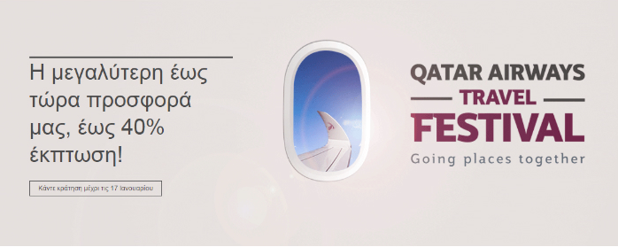 Η Qatar Airways προσφέρει αποκλειστικές προσφορές για αεροπορικά εισιτήρια, ξενοδοχεία και ενοικιάσεις αυτοκινήτων σε περισσότερα από 150 μέρη σε όλο τον κόσμο. Κάνε κράτηση έως τις 17 Ιανουαρίου 2016 και επωφελήσου από τους ειδικούς ναύλους με έκπτωση έως -40% στην Οικονομική και Διακεκριμένη Θέση για ταξίδια μεταξύ 19 Ιανουαρίου και 15 Δεκεμβρίου 2016.