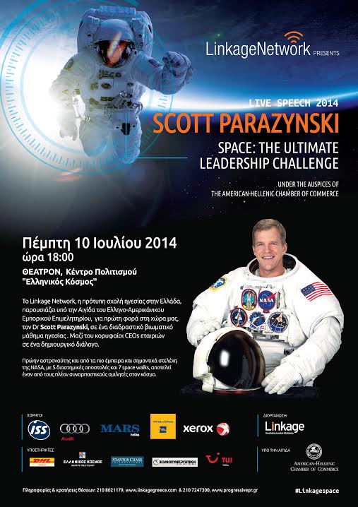 Το Linkage Network, η κορυφαία σχολή ηγεσίας στην Ελλάδα, η οποία συμπυκνώνει την πρωτοποριακή τεχνογνωσία της Linkage, της μεγαλύτερης εταιρίας συμβούλων επιχειρήσεων σε θέματα ηγεσίας διεθνώς, μας συστήνει τον καταξιωμένο πρώην Αστροναύτη της NASA Dr Scott Parazynski σε ένα μοναδικό μάθημα ηγεσίας. Ένας από τους πιο πετυχημένους αστροναύτες στην ιστορία εξερεύνησης του διαστήματος, ο Dr Scott Parazynski θα αναπτύξει θέματα ηγεσίας και άντλησης δύναμης μέσα από τα προσωπικά του βιώματα και την εντυπωσιακή του εμπειρία, σε μια διαδραστική ομιλία με τίτλο «Διάστημα: Η κορυφαία εμπειρία ηγεσίας» (SPACE: The Ultimate Leadership Challenge), την Πέμπτη 10 Ιουλίου 2014, στο ΘΕΑΤΡΟΝ, Κέντρο Πολιτισμού «Ελληνικός Κόσμος».