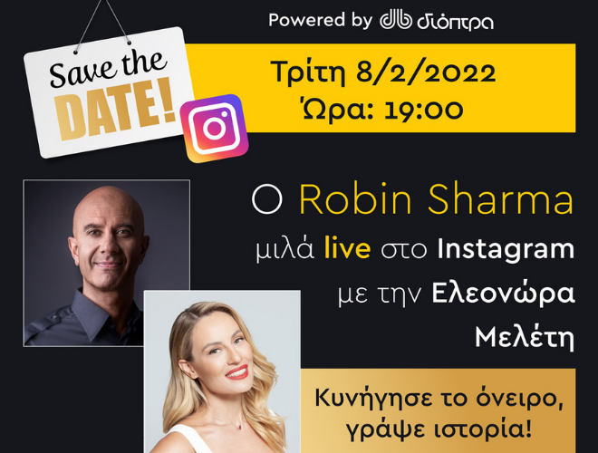 Ο Robin Sharma, ο κορυφαίος ομιλητής και σύμβουλος σε θέματα προσωπικής ανάπτυξης και επαγγελματικής επιτυχίας, συντονίζει το ρολόι του με την ελληνική ώρα στις 8 Φεβρουαρίου 2022 στις 19:00 για μία συνάντηση με την Ελεονώρα Μελέτη και τους Έλληνες αναγνώστες του.