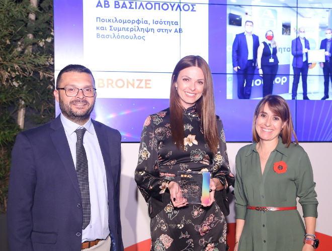 Επιπλέον, διπλή και Bronze διάκριση απέσπασε η ΑΒ Βασιλόπουλος στις κατηγορίες «Best Companies – Retail» και «Best Initiative – Ethnicity» των Diversity & Inclusion Awards 2022 για τις «Ευκαιρίες Απασχόλησης στην ΑΒ Βασιλόπουλος» και την «Ποικιλομορφία, Ισότητα και Συμπερίληψη στην ΑΒ Βασιλόπουλος». Και δεν έμεινε εκεί, καθώς η πρώτη ολοκληρωμένη πρωτοβουλία για την ενδυνάμωση της γυναικείας επιχειρηματικότητας του ReGeneration «έδωσε» το Gold βραβείο στα Women Empowerment Awards για το ReGeneration FEMpowerment Initiative, που υλοποιήθηκε με την υποστήριξη της Πρεσβείας των Η.Π.Α. στην Αθήνα και της ΑΒ Βασιλόπουλος, υπό την καθοδήγηση του Women On Top. Όλα αυτά επιβεβαιώνουν πως η εταιρεία δίνει ίσες ευκαιρίες σε όλους, υποστηρίζει τη γυναικεία ενδυνάμωση και στοχεύει στη δημιουργία ενός συμπεριληπτικού εργασιακού περιβάλλοντος που αναδεικνύει τη μοναδικότητα και σέβεται τη διαφορετικότητα.
