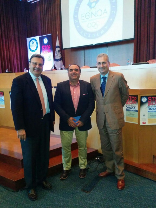 Πράγματι, δεν ήταν λίγα τα αιτήματα των φίλων εκπαιδευτικών που λαμβάναμε και η εμφανής ανάγκη τους, για μεθοδευμένη και επιστημονική ενημέρωση, πάνω στις μεθόδους αντιμετώπισης αυτών των φαινομένων. Σήμερα ανάμεσα μας βρίσκονται πολλοί εκπαιδευτικοί, οι οποίοι περισσότερο από τον καθένα μας, παρατηρούν και καλούνται να αντιμετωπίσουν τέτοια κρούσματα στις σχολικές μονάδες, που δυστυχώς, ολοένα και αυξάνονται. Θέλω να τους ευχαριστήσω για την σημερινή συμμετοχή τους, αλλά και την άριστη σχέση εμπιστοσύνης που έχουν τόσα χρόνια με την Εθνική Ολυμπιακή Ακαδημία της Ελλάδας.»