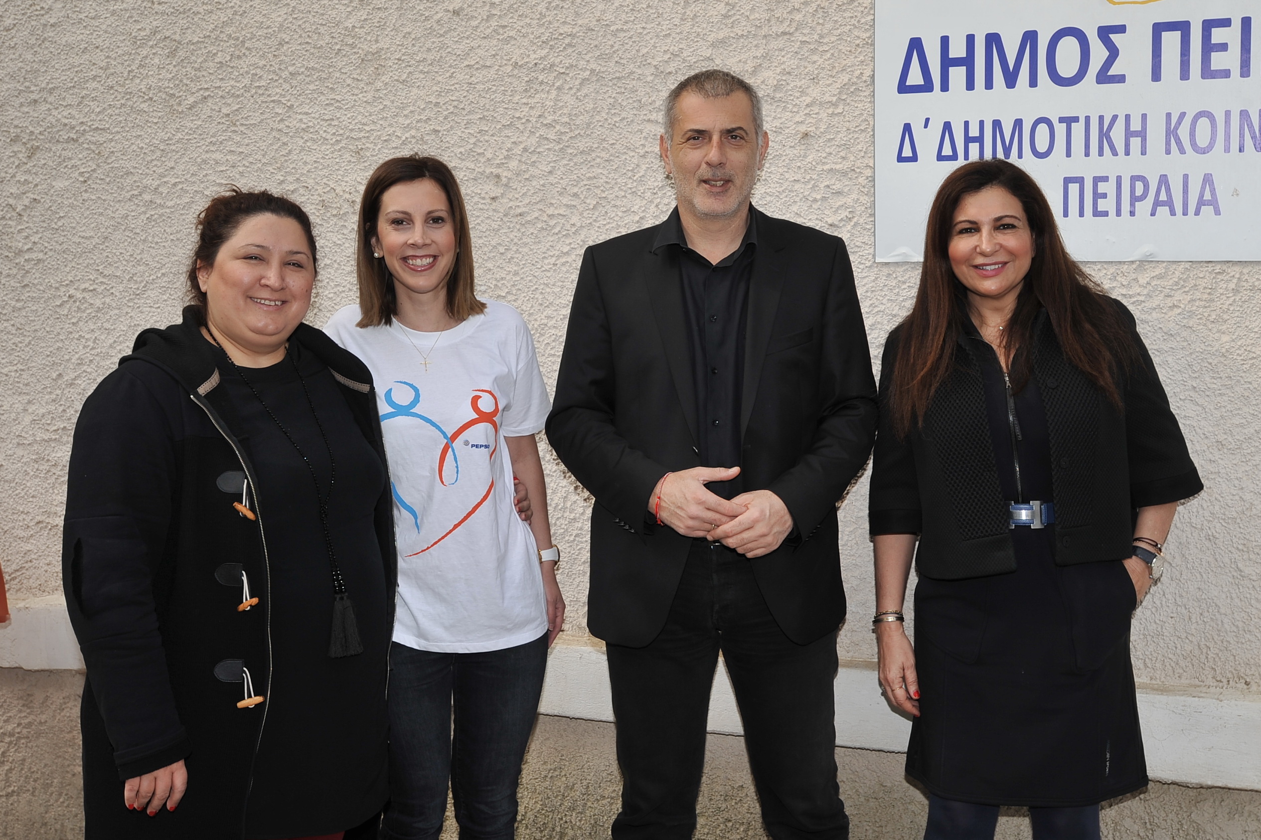 Οι κκ. Αναστασία Μακαριγάκη, Ιωάννα Τσιούρβα και Ναυσικά Πανούση από την PepsiCo με τον Δήμαρχο Πειραιά κ. Γιάννη Μώραλη στη διανομή προϊόντων από τα Lay’s Smiles