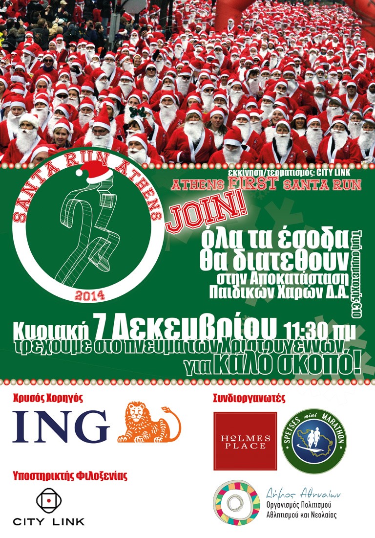 Την Κυριακή, 7 Δεκεμβρίου 2014 θα διεξαχθεί στο κέντρο της Αθήνας για πρώτη φορά το Santa Run, ο διεθνής θεσμός που έχει καθιερωθεί σε πλήθος μητροπόλεων παγκοσμίως με μεγάλη επιτυχία.
