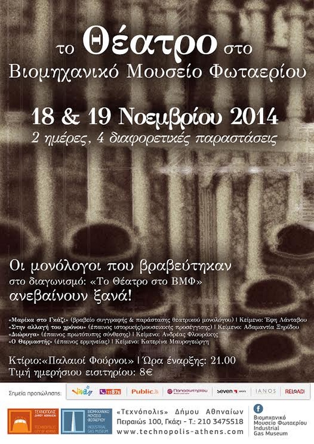 Την Τρίτη 18 Νοεμβρίου και την Τετάρτη 19 Νοεμβρίου θα επαναληφθούν οι παραστάσεις των τεσσάρων μονολόγων που βραβεύτηκαν από κοινό και επιτροπή στο πλαίσιο του διαγωνισμού «Το θέατρο στο Βιομηχανικό Μουσείο Φωταερίου» που διεξήχθη το Μάιο του 2014.