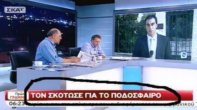 Λίγο μετά από τη δολοφονία του Παύλου Φύσσα η εκπομπή “Πρωινή Γραμμή” του ΣΚΑΪ έγραφε : “Τον σκότωσε για το ποδόσφαιρο”. Η μητέρα του Φύσσα θα βγει στο ίδιο κανάλι λίγες ημέρες αργότερα φωνάζοντας: “Εσείς σκοτώσατε το παιδί μου”. Ήταν το πρωινό της 19ης Σεπτεμβρίου του 2013.