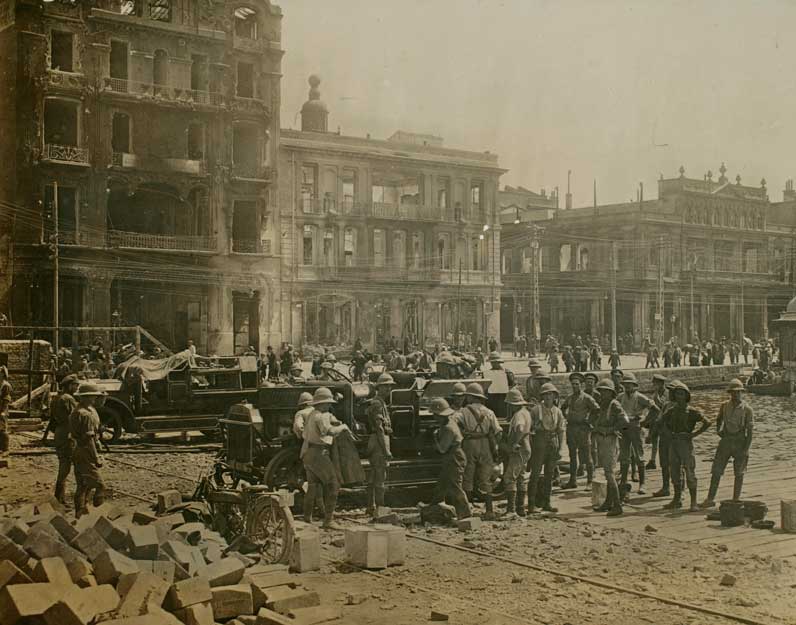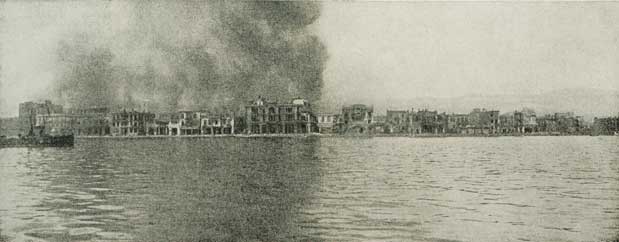 «Εκεί όπου άλλοτε απλώνονταν οι λαβύρινθοι των εβραϊκών συνοικιών, υπήρχαν τώρα μονάχα πέτρες και πυρωμένη στάχτη. Στην άλλη περιοχή, όπου υψώνονταν τα μεγάλα καταστήματα και τα ξενοδοχεία, τραγικά ερείπια θύμιζαν την παλιά τους δόξα. Κι όλα τούτα τα θλιβερά κατάλοιπα μιας πλούσιας μεγάλης πολιτείας, ήσαν τυλιγμένα σε βαριά σύννεφα καπνού. Στα βαθιά τους υπόγεια η χόβολη είχε συντηρηθεί για πολλούς μήνες μετά την φωτιά, και, καθώς διαπιστώθηκε αργότερα, τόση ήταν η δύναμη τούτης της φωτιάς, ώστε όλα τα γυάλινα είδη είχαν λιώσει και μέσα στα χαλάσματα των ζαχαροπλαστείων μπορούσε κανείς να διακρίνει τα βάζα με τις καραμέλες, που χανε μεταβληθεί σε μια μάζα από καμένη ζάχαρη και γυαλί». (4)