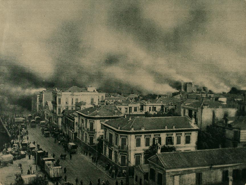 «Είδα να καίγονται τα δύο τρίτα σχεδόν της παλιάς Θεσσαλονίκης (…) Όπως πλησίαζα, βλέπω μια σειρά από σπίτια ν’ αρπάζουν φωτιά με απελπιστική ταχύτητα. Ο κόσμος μετακινείται πυρετωδώς, παίρνοντας μαζί του ό,τι βρει μπροστά του, σκεπάσματα, έπιπλα, μέσα σε μια χαώδη κατάσταση. Μερικοί ξεκρεμούν τα παντζούρια και τα πετούν στον δρόμο, στην τύχη, μαζί με ότι να γλυτώσουν. Θέαμα δυστυχίας, αξιοθρήνητη και σπαρακτική έξοδος των φτωχών σε λίγο και των πλούσιων, άνδρες, γυναίκες, παιδιά, γέροι που τρέχουν μέσα στον συνωστισμό σε δρομάκια γεμάτα, αντικείμενα μαζεμένα αλλοπρόσαλλα, ενώ αρχίζει κιόλας η λεηλασία. Καμία περιφρούρηση, καθόλου νερό ή αντλίες, καμία παρουσία της εξουσίας». (2)