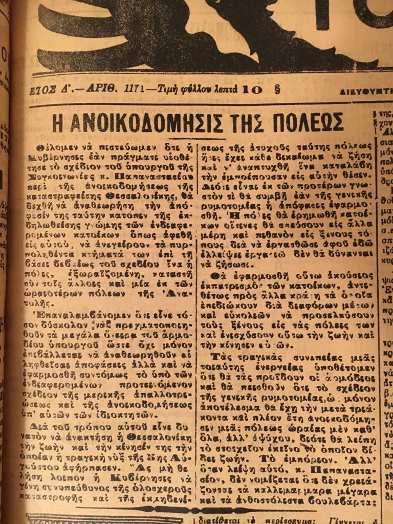 Στο Παρίσι, en route, συναντήσαμε τον κ. Βενιζέλο. Ήταν ενθουσιασμένος με την προοπτική της Νέας Θεσσαλονίκης, σχεδόν θεωρούσε την πυρκαγιά σταλμένη από τη θεία πρόνοια, καθώς έδινε την ευκαιρία να σχεδιασθεί μια πόλη αντάξια μιας θαυμάσιας τοποθεσίας, ενός ευημερούντος λιμανιού και της έδρας την διοίκησης της Μακεδονίας