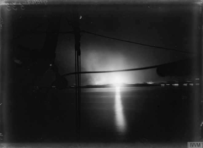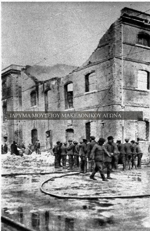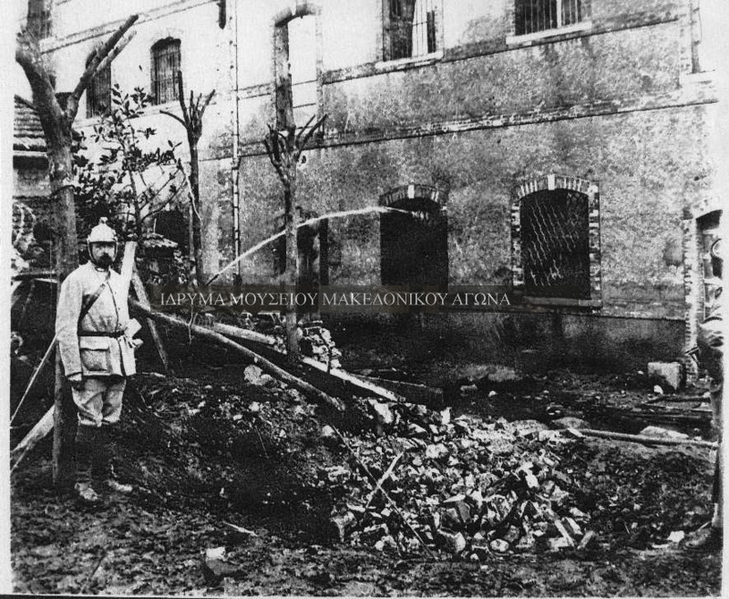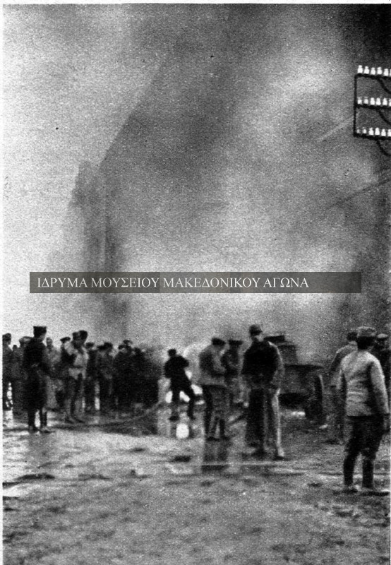 Ο βομβαρδισμός της Τράπεζας της Θεσσαλονίκης από το Ζέπελιν σε φωτογραφία από στρατιωτικό πλοίο που είχε αράξει ανοιχτά του λιμανιού της πόλης