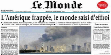 Μετά την επίθεση, οι Ηνωμένες Πολιτείες έτυχαν πρωτοφανούς υποστήριξης από όλον σχεδόν τον κόσμο. Ποιος θα ξεχάσει το χαρακτηριστικό εξώφυλλο της εφημερίδας “Le Monde” την επόμενη μέρα, με τίτλο “Είμαστε όλοι Αμερικανοί”.