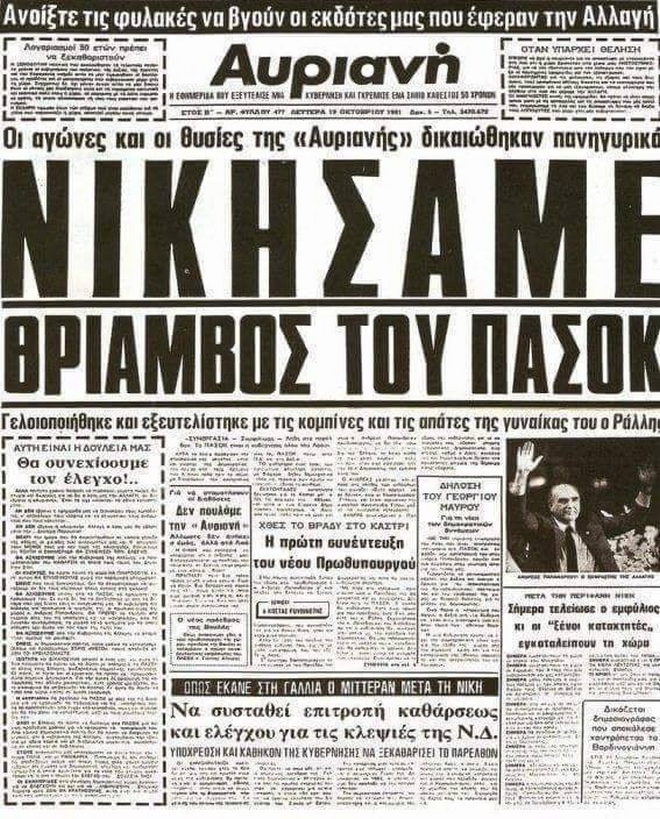 Με συνθήματα όπως «Η Ελλάδα ανήκει στους Έλληνες» και «Εδώ και τώρα, αλλαγή», ο Ανδρέας Παπανδρέου επικρατούσε του πρωθυπουργού και προέδρου της Νέας Δημοκρατίας Γεώργιου Ράλλη με ευρεία κοινοβουλευτική πλειοψηφία, την ώρα που ο Κωνσταντίνος Καραμανλής είχε «μετακομίσει» στην Προεδρία της Δημοκρατίας.