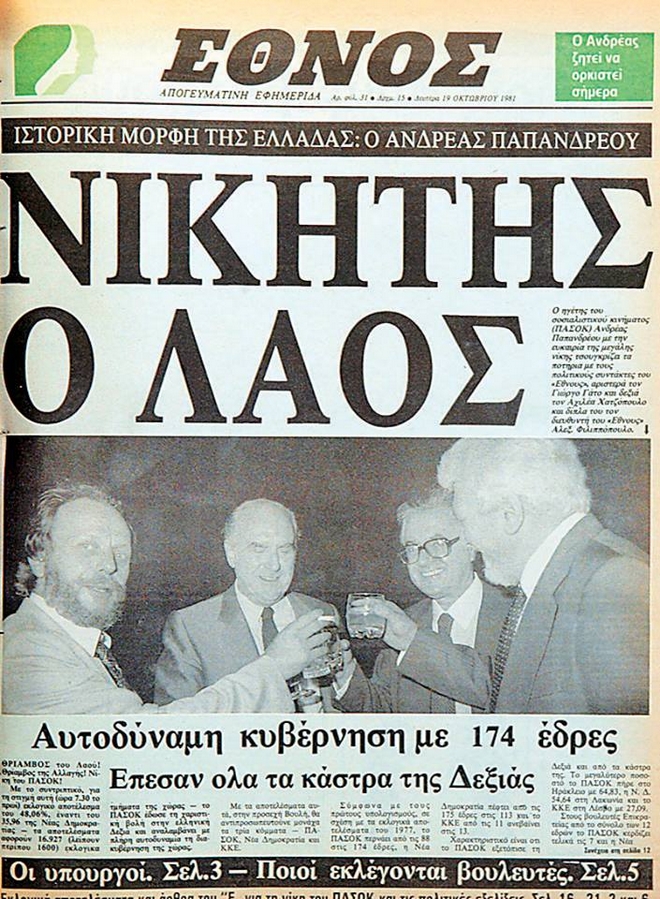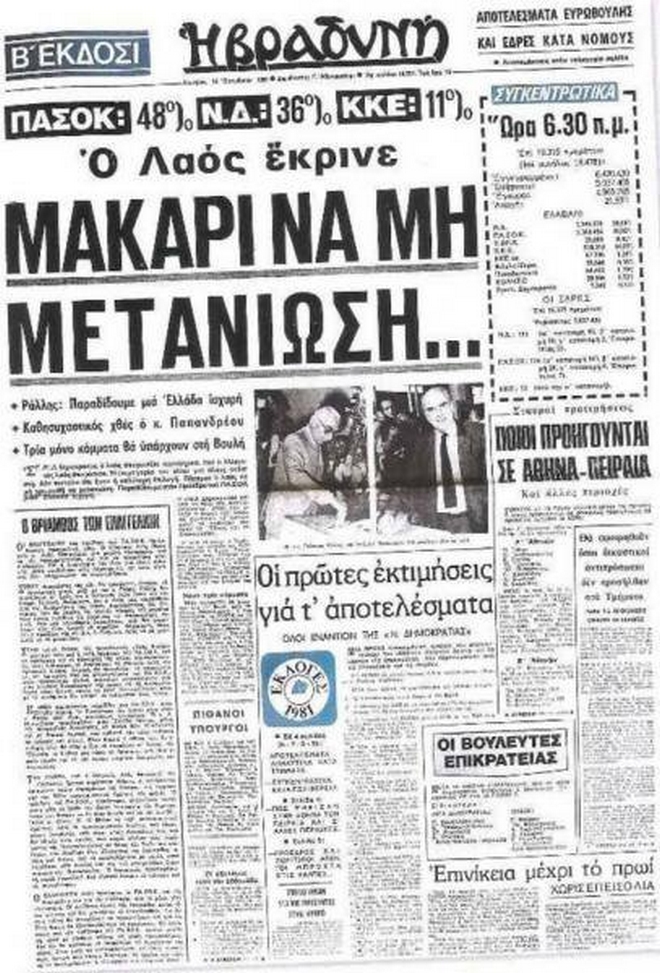 Σαν σήμερα, το 1981, ο Ανδρέας Παπανδρέου και το ΠΑΣΟΚ κερδίζουν τις βουλευτικές εκλογές με ποσοστό 48,06%, έναντι 35,86% της Νέας Δημοκρατίας και 10,93% του ΚΚΕ.