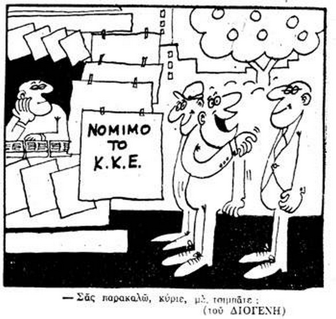 «Έπειτα από 27 χρόνια συνεχούς παρανομίας, το ΚΚΕ κατακτά τη νομιμότητα. Είκοσι επτά χρόνια το ΚΚΕ, η ύπαρξή του, η δράση του, θεωρούνταν απ’ το επίσημο κράτος με ειδικό νόμο, το νόμο 509, έγκλημα.