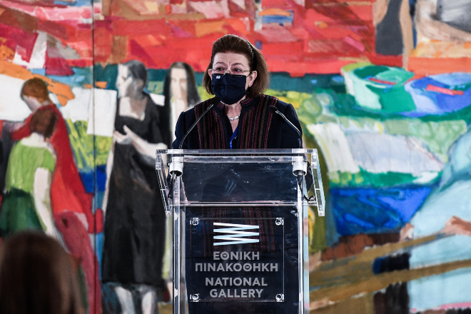 Ακολούθησαν σύντομες ομιλίες από τον πρωθυπουργό, την υπουργό Πολιτισμού Λίνα Μενδώνη και τη διευθύντρια της Εθνικής Πινακοθήκης Μαρίνα Λαμπράκη – Πλάκα.