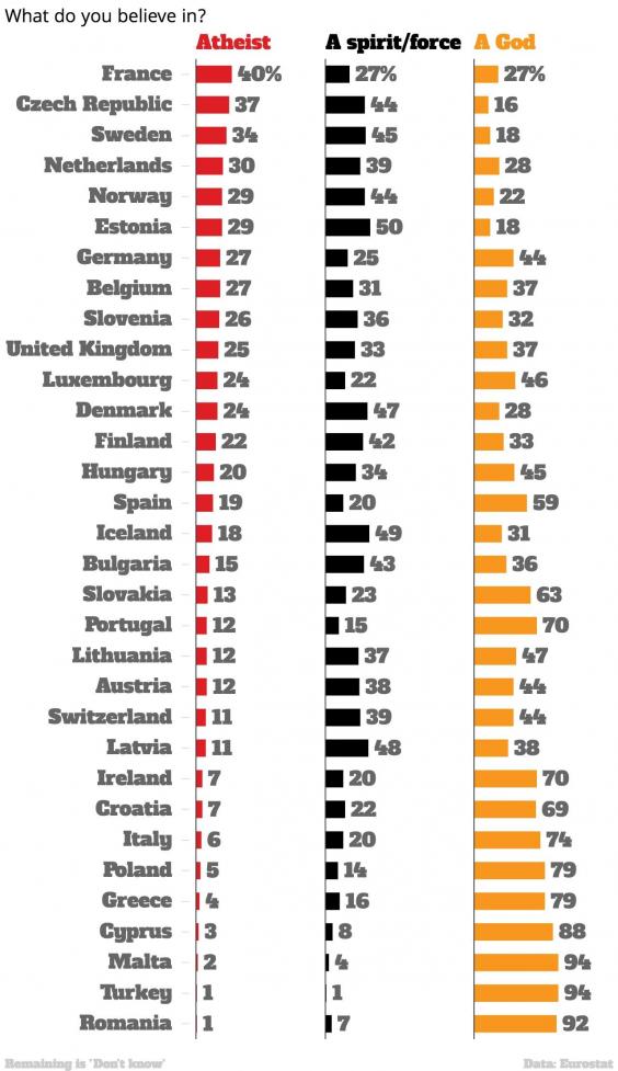 Αυτό δείχνουν τα στοιχεία της Ευρωπαϊκής Επιτροπής σχετικά με τις λιγότερο θρήσκες χώρες. Το 40% των Γάλλων δεν πιστεύουν στο θεό.