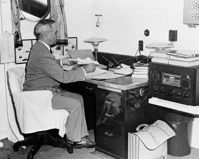 Ο Αμερικανός πρόεδρος Χάρυ Τρούμαν, εν πλω, διαβάζει τις αναφορές για το βομβαρδισμό της Χιροσίμα.