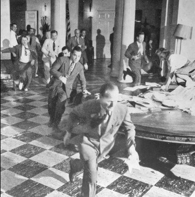 Στιγμιότυπο από το γραφείο τύπου του Λευκού Οίκου τη στιγμή που ο Τρούμαν ανακοινώνει την παράδοση της Ιαπωνίας στις 15 Αυγούστου 1945.
