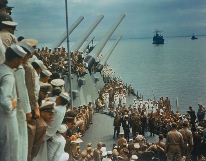 Στρατιώτες και ναύτες στο USS Missouri παρακολουθούν την επίσημη παράδοση της Ιαπωνίας στο Tokyo Bay στις 2 Σεπτεμβρίου 1945.
