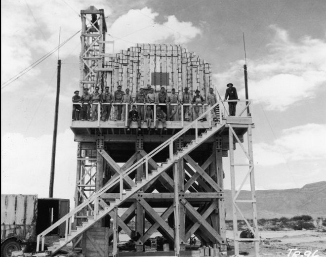 Εργάτες στο Los Alamos ποζάρουν μαζί με 100 τόνους TNT.