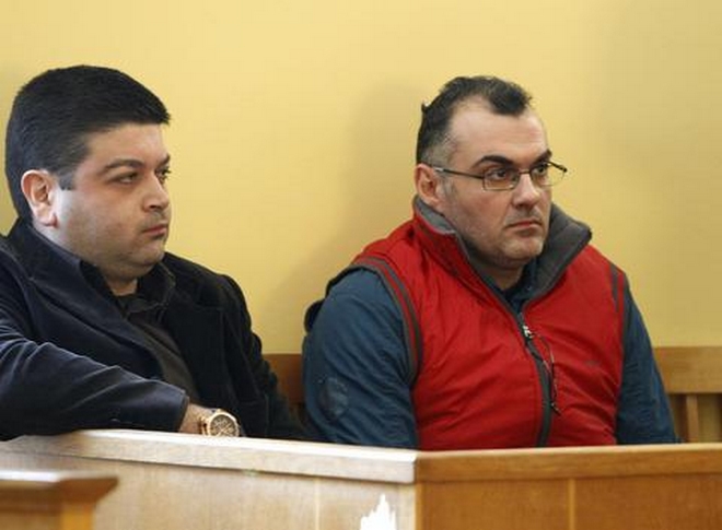 Defendants Epaminondas Korkoneas (R) and Vassilis Saraliotis wait for their trial to start inside a court hall in Amfissa town, northwest of Athens January 20, 2010. Korkoneas and Saraliotis will face a court trial for the fatal shooting of teenager Alexandros Grigoropoulos on December 2008, which sparked the country's worst riots in decades. REUTERS/Yiorgos Karahalis (GREECE - Tags: CRIME LAW) REUTERS