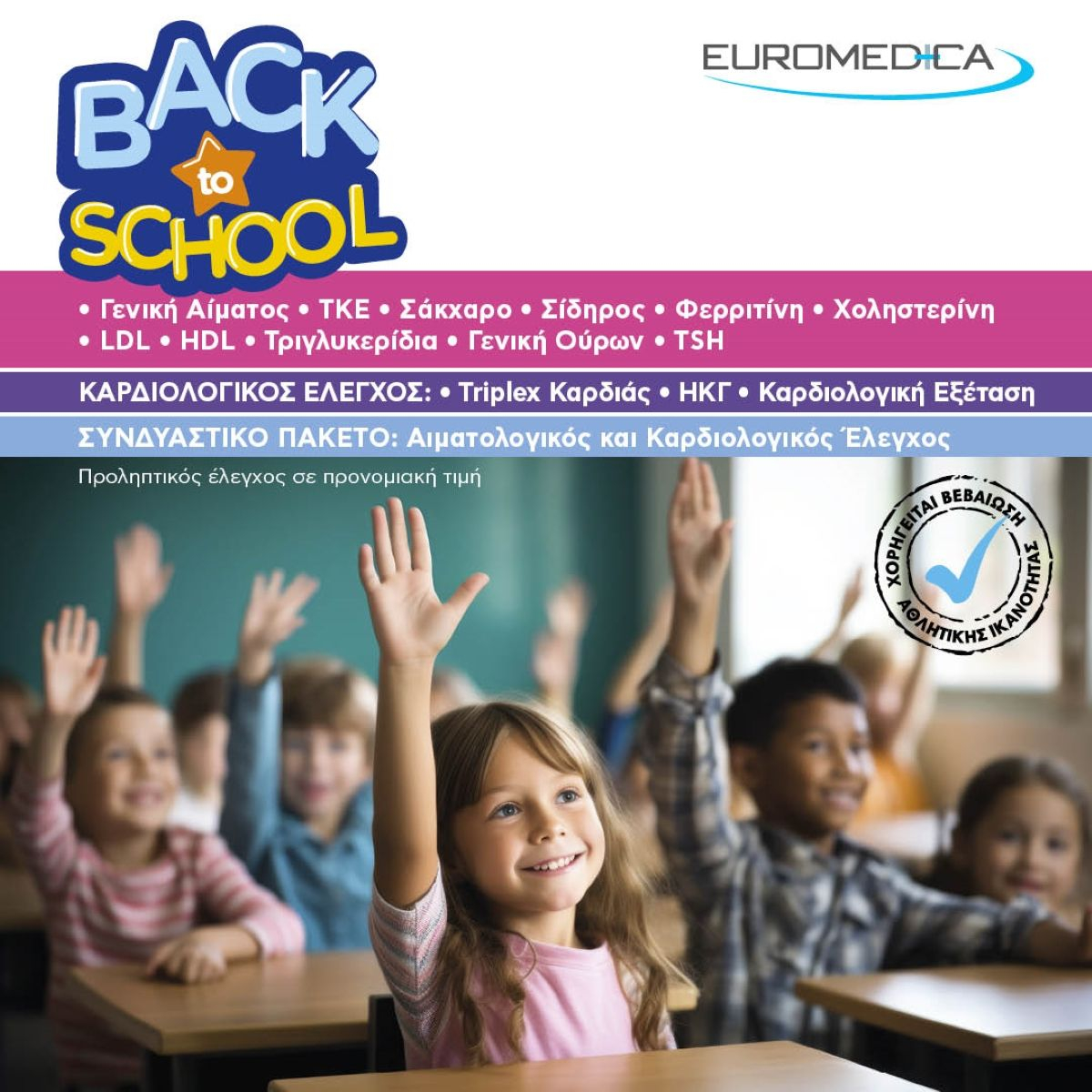 Με την αξιοπιστία που τον χαρακτηρίζει κι αναγνωρίζοντας την αξία της πρόληψης και της έγκαιρης διάγνωσης, ο όμιλος Euromedica προσφέρει και φέτος μια σειρά από ειδικά διαμορφωμένα πακέτα προληπτικών εξετάσεων “Back to Work & Back to School” για μεγάλους και μικρούς , δίνοντας τη δυνατότητα σε ενήλικες και παιδιά να ξεκινήσουν τη νέα σεζόν με ασφάλεια, γνώση και φροντίδα για τον εαυτό τους.