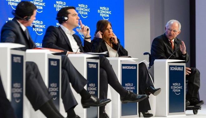 Στις 21 Ιανουαρίου του 2016, ο πρωθυπουργός βρέθηκε στο οικονομικό φόρουμ του Νταβός, όπου συμμετείχε σε τραπέζι με θέμα “Το μέλλον της Ευρώπης”. Στην ίδια συζήτηση βρέθηκαν εκτός από τον Έλληνα πρωθυπουργό και ο Γερμανός υπουργός Οικονομικών, Βόλφγκανγκ Σόιμπλε. Οι δυο τους διασταύρωσαν τα ξίφη τους, κατά τη διάρκεια της συζήτησης, με τον Έλληνα πρωθυπουργό να αναφέρεται στην αποτυχία του τρόπου, με τον οποίον η Ευρώπη αντιμετώπισε την κρίση.