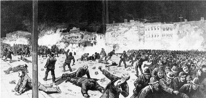 όλα μαρτυρούν πως τα πράγματα θα ξεφύγουν σύντομα από τον έλεγχο, περιμένοντας την αφορμή που δεν άργησε να έρθει. Ένας “άγνωστος” έριξε μία βόμβα, που εξερράγη ανάμεσα στους εργάτες. Επικράτησε πανικός και αμέσως αναλαμβάνει δράση κι η αστυνομία. Ξεκινά να πυροβολεί προς το πλήθος σκοτώνοντας τέσσερις εργάτες. Είναι το πρώτο αίμα των οργανωμένων διεκδικήσεων.