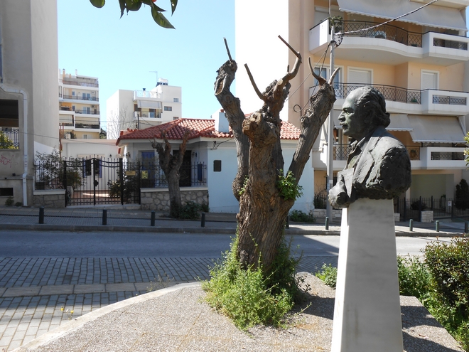 Προτομή του ποιητή. Στο βάθος διακρίνεται το σπίτι του