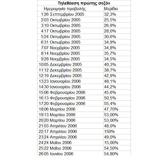 Τηλεμερίδιο ανά επεισόδιο για την πρώτη σεζόν (2005-2006)