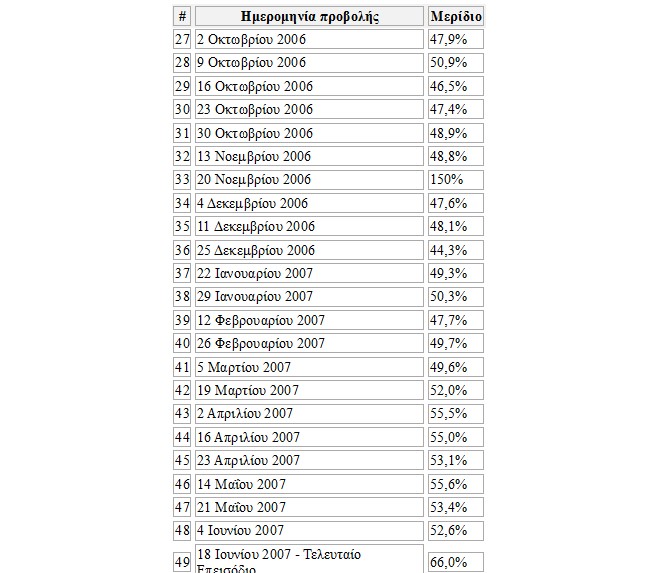 Τηλεμερίδιο ανά επεισόδιο την δεύτερη σεζόν (2006-2007)