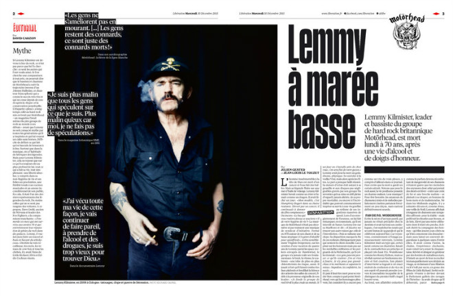Μια ασπρόμαυρη φωτογραφία του Lemmy Kilmister καλύπτει ολόκληρο το εξώφυλλο της γαλλικής Liberation, όπως και κάθε της κεντρικό θέμα άλλωστε. Ο μπασίστας των motorhead πέθανε την Τρίτη σε ηλικία 70 ετών. Το εκτενές τετρασέλιδο δημοσίευμα, πέραν του εξωφύλλου, εξιστορεί την μουσική διαδρομή ενός “μύθου” της μέταλ μουσικής και παραθέτει σειρά από δηλώσεις του που έχουν μείνει στην ιστορία.