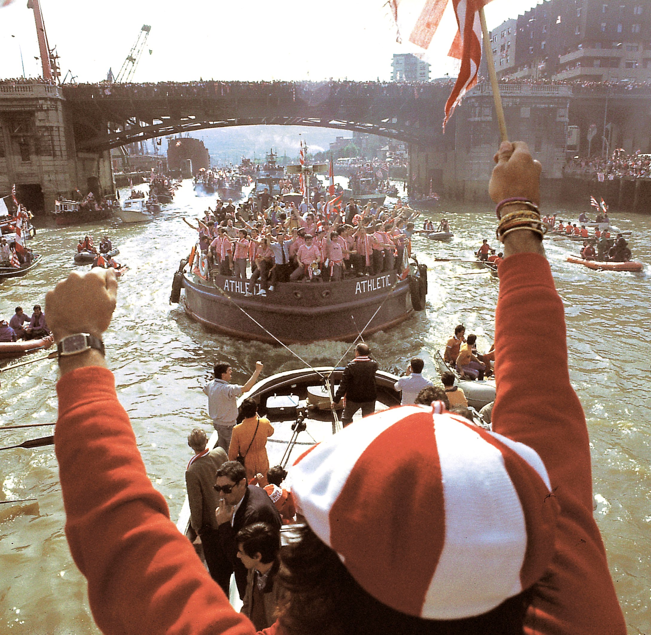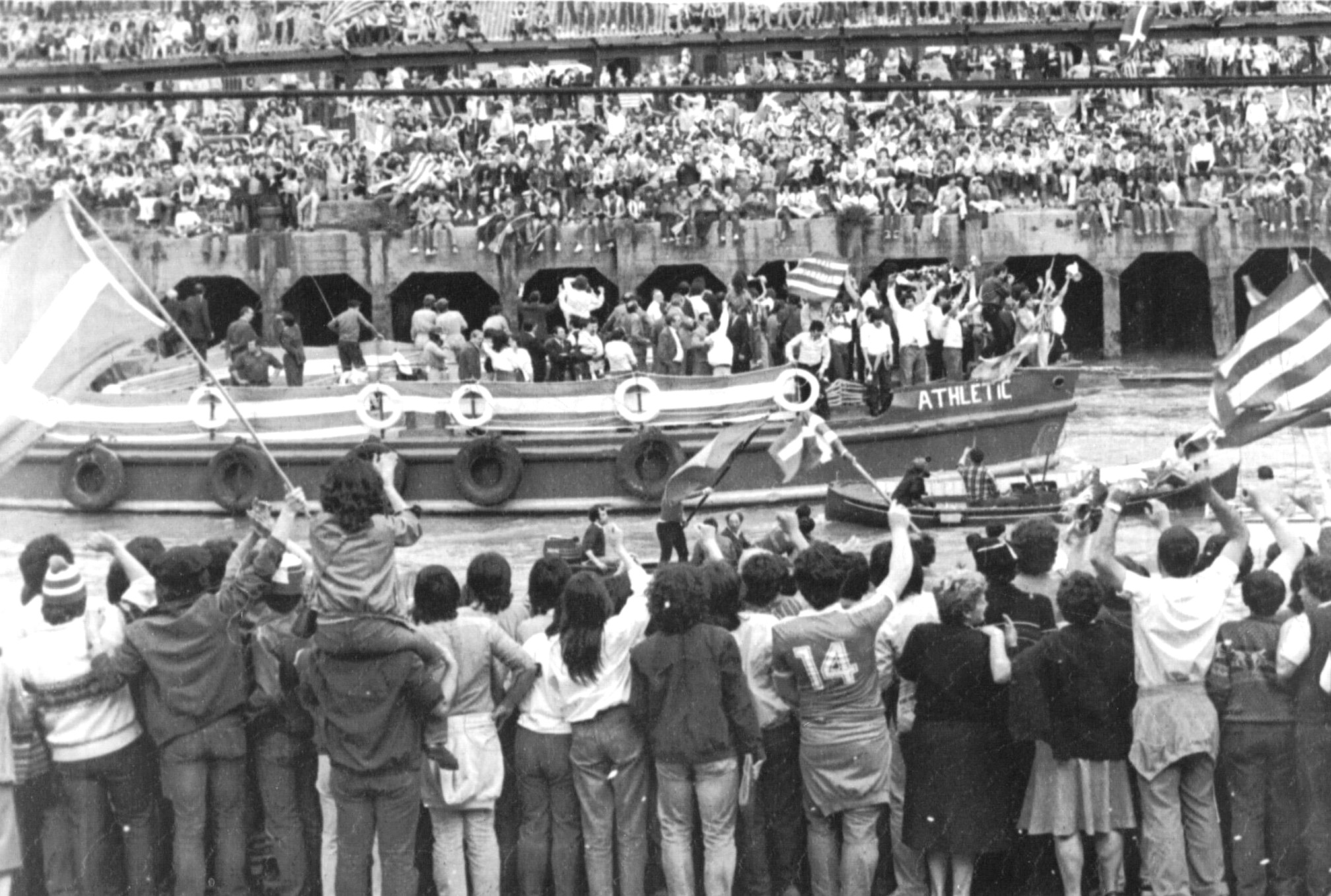 Στην αριστερή όχθη στέκονταν οι εργάτες των υψικάμινων με τις χαρακτηριστικές μπλε φόρμες, από την άλλη μεριά χαιρετούσαν οι εργάτες των ναυπηγείων, οι μαθητές ήταν κι αυτοί εκεί αφού τα σχολεία είχαν κλείσει για την περίσταση, ακόμα και οι φοιτητές είχαν φύγει από τις σχολές τους ονομάζοντας την κοπάνα τους, “απεργία της φιέστας”. Η gabarra χρειάστηκε τρεις ώρες για να διασχίσει όλη τη ría, σε μια ημέρα που έμεινε αξέχαστη σε όλη την πόλη. Θα περνούσε μόνο ένας χρόνος, μέχρι οι φίλοι της Αθλέτικ να ξαναζήσουν ανάλογες στιγμές. Και αυτή τη φορά ο λόγος θα ήταν διπλός, όχι μόνο το πρωτάθλημα, αλλά και το Κύπελλο. Η Λίγκα της σεζόν 1983/84 εξελίχθηκε σε τριπλή μάχη ανάμεσα σε “λιοντάρια”, “μερένγκες” και “μπλαουγκράνα”. Οι τρεις τους έφτασαν στην τελευταία αγωνιστική ως εξής: Αθλέτικ 47, Ρεάλ Μαδρίτης 47 και Μπαρτσελόνα 46.