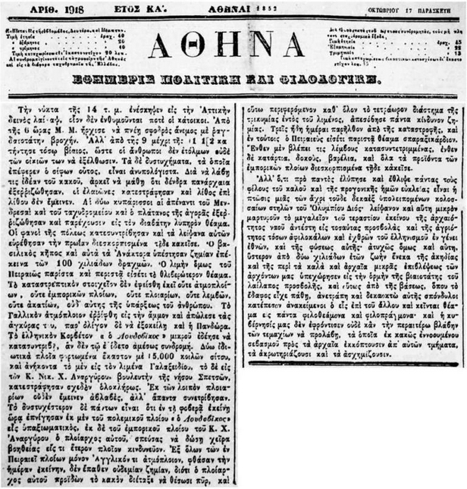 Ήταν βράδυ 14 προς 15 Οκτωβρίου ( 27 Οκτωβρίου αναγράφεται με το νέο ημερολόγιο στην παραπάνω reanalysis) όταν πέραν των λοιπών καταστροφών η μία από τις τρεις κολώνες που έστεκαν χωριστά από τις υπόλοιπες στο ναό του Ολυμπίου Διός, στο κέντρο της πόλης, κατέπεσε. Το συμβάν αυτό θεωρήθηκε τόσο σημαδιακό από τους Αθηναίους, ώστε επί πολλές δεκαετίες αργότερα, όταν ήθελαν να προσδιορίσουν την εποχή εκείνη, έλεγαν χαρακτηριστικά: «τον καιρό της κολώνας».