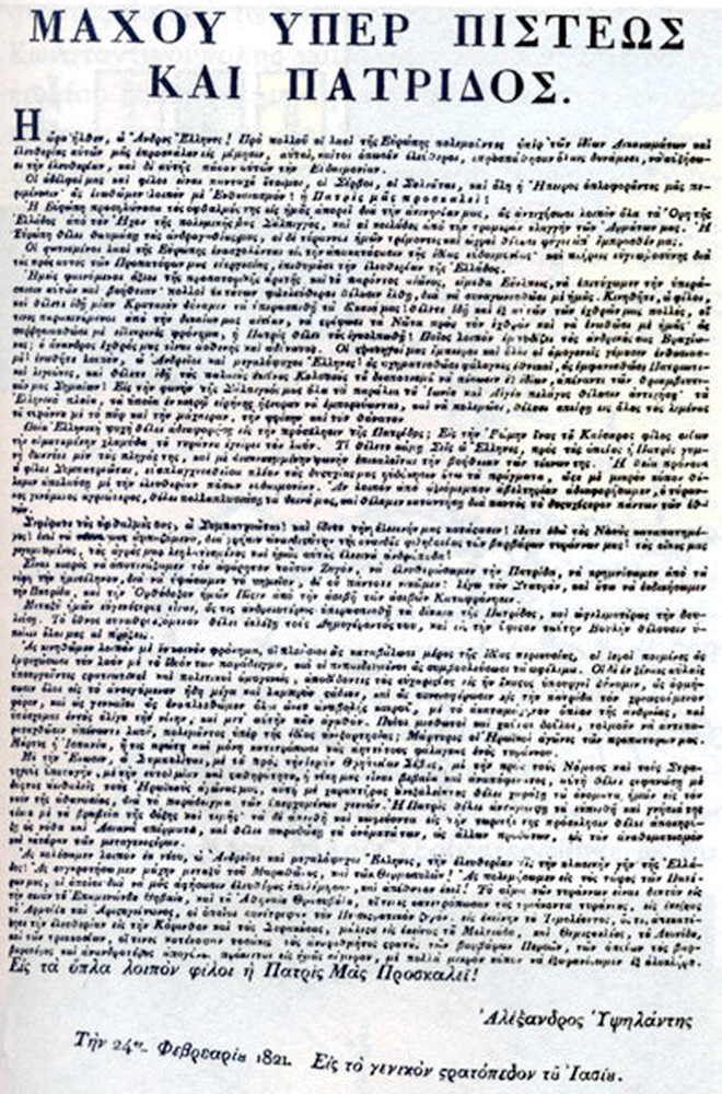 Η επαναστατική προκήρυξη που κυκλοφόρησε ο Αλέξανδρος Υψηλάντης στο Ιάσιο της Μολδοβλαχίας, σαν σήμερα στις 24 Φεβρουαρίου 1821, σηματοδότησε την έναρξη της Επανάστασης στις παραδουνάβιες ηγεμονίες. Η προκήρυξη καλεί όλους τους Έλληνες να ξεσηκωθούν και αναφέρεται στους αγώνες που έκαναν οι ευρωπαϊκοί λαοί για να διώξουν τους τυράννους τους. Ακόμη, διαβεβαιώνει έμμεσα ότι η Ρωσία (η «Κραταιά δύναμις» του κειμένου) θα βοηθήσει την Ελληνική Επανάσταση.