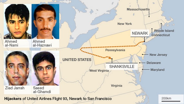 Στο τέταρτο και τελευταίο αεροσκάφος (Boeing 757-222, πτήση 93 της United Airlines) δεν επιβιβάστηκαν πέντε, αλλά τέσσερις τρομοκράτες. Επρόκειτο για τους Ζιάντ Τζάρα, Αχμέντ αλ-Χαζνάουι, Αχμέντ αλ-Νάμι και Σαίντ αλ-Γκάμντι.
