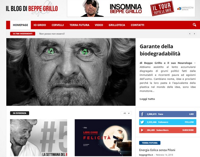 Ξεκάθαρα χρησιμοποιούσε το blog, για να περνά τα μηνύματα του. Παράλληλα, τόνιζε το ρόλο του διαδικτύου ως προάγγελου νέων δυνατοτήτων για άμεση δημοκρατία και για μια πιο δίκαιη κοινωνία. Από τον Οκτώβριο του 2011 απέσυρε τα ιαπωνικά. Το Δεκέμβριο του 2015 ακολούθησαν τα αγγλικά. Έκτοτε γράφει μόνο στα ιταλικά. Και φυσικά υπάρχει ένας πολύ καλός λόγος για αυτό. Πριν προχωρήσουμε, ωστόσο θα θέλαμε να σταθούμε στο πώς το blog τον βοήθησε να κάνει γνωστές τις απόψεις του -και τις θέσεις του- σε ένα τεράστιο κοινό. Η απήχηση ήταν τέτοια που ο δια βίου αποκλεισμός από τη RAI άρθηκε, ώστε να εμφανιστεί σε πολιτική συζήτηση (Porta a Porta), το 2014 και να μιλήσει για την εκστρατεία του για την Ευρωβουλή. Τρία εκατομμύρια τηλεθεατές συντονίστηκαν με το show.