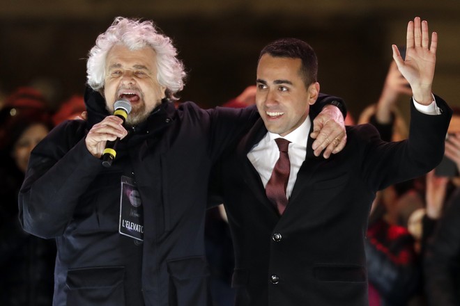 Το Movimento 5 Stelle έχει, τυπικά, ως ηγέτη τον δημοσιογράφο/webmaster και αντιπρόεδρο της Βουλής, Luigi Di Magio. Για όλα αποφασίζει -ενίοτε και διατάζει- ο κωμικός/blogger Beppe Grillo, φίλος του Nigel Farage και της Marine Le Pen. Αυτοί ήταν οι πρώτοι που συνεχάρησαν το Κίνημα για την πρωτιά, στις εκλογές της Κυριακής 4/3 . Κάτι που όλοι έβλεπαν να έρχεται, σύμφωνα με δηλώσεις ουκ ολίγων ηγετών της Ευρώπης -συμπεριλαμβανομένων Ιταλών- μέσα στα χρόνια, χωρίς να κάνουν κάτι να μη συμβεί αυτό.
