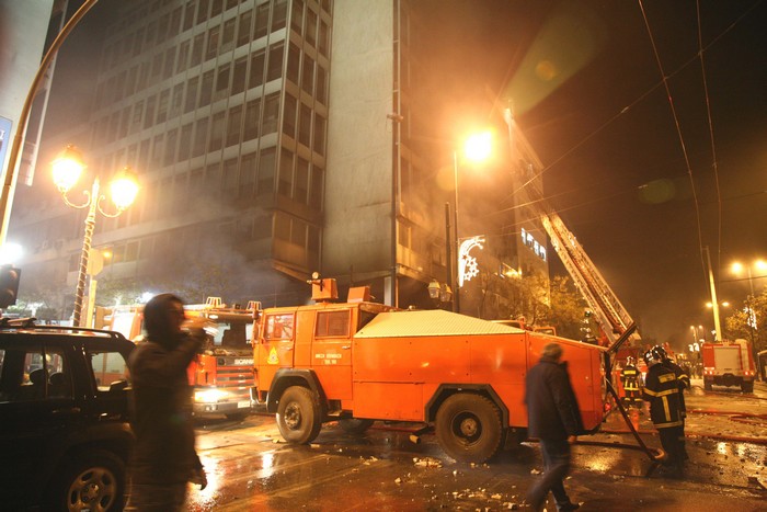 Στις περίπου δύο το απόγευμα, εκδηλώνεται πυρκαγιά, όταν, σύμφωνα με τα στοιχεία, επί της οδού Σταδίου εκινείτο ο κύριος όγκος των διαδηλωτών της Εξωκοινοβουλευτικής Αριστεράς και του αντιεξουσιαστικού χώρου.
